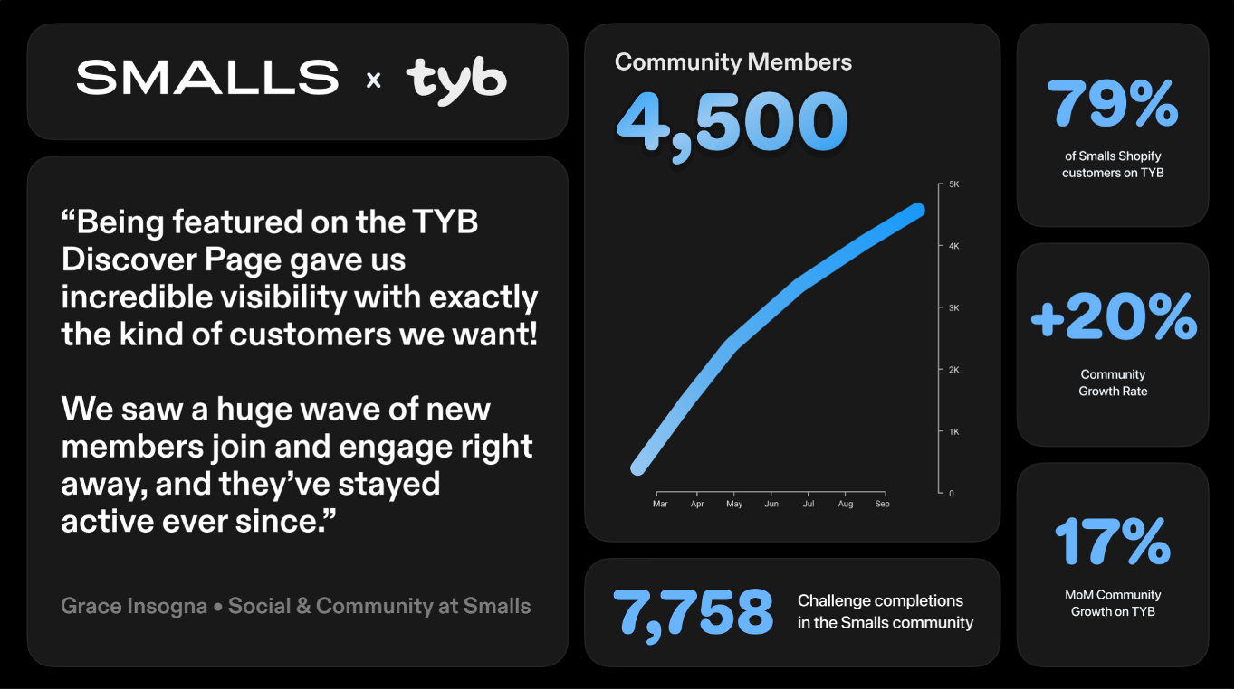 Smalls partners with TYB to connect with their ideal customers, leading to immediate engagement. With 79% of Shopify customers active on TYB, the community grew 20%, with a 17% monthly increase, resulting in over 7,700 challenge completions among 4,500 members.